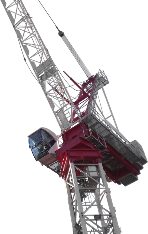 A grua tipo plano CTT 172-8 tem comprimento máximo de braço de 65 m e capacidade máxima de 8 t.