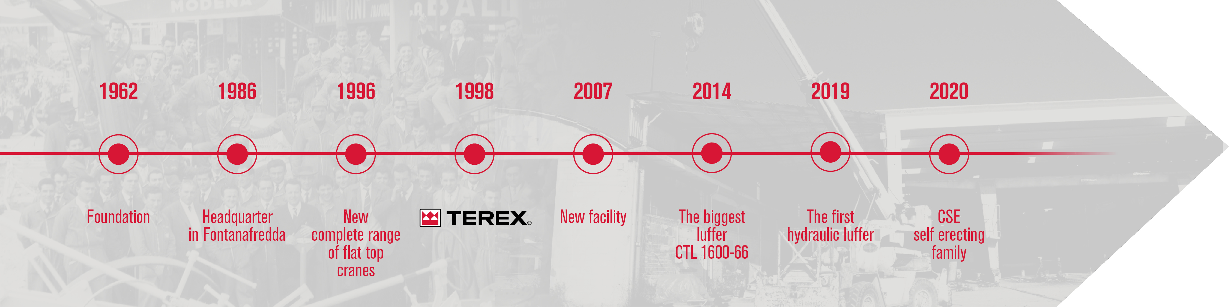 The Company was established in 1962 and in 1986 the manufacturing moved to Fontanafredda, rapidly becoming the reference brand in the market for Flat Top Tower Cranes. In 1998 the company became part of Terex Corporation that invested on a fully brand new facility opened in 2007. Since then, Terex has been strongly investing in research & development, launching new cranes leading the market as the biggest luffer CTL 1600-66 with 66 ton capacity in 2014 and the first hydraulic luffer in 2019.